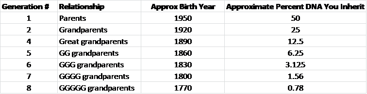The gist of the actual findings is that Warren’s native American ancestry is less than that of the average American of European origin, and probably somewhere between a possible high of 3% to a low of under 1%. Here’s a chart from this site explaining what a 6th generation back percentage would be; 6th generation is the most recent Native American ancestor Warren might have according to her published results, and it could be as far back as 10th generation.