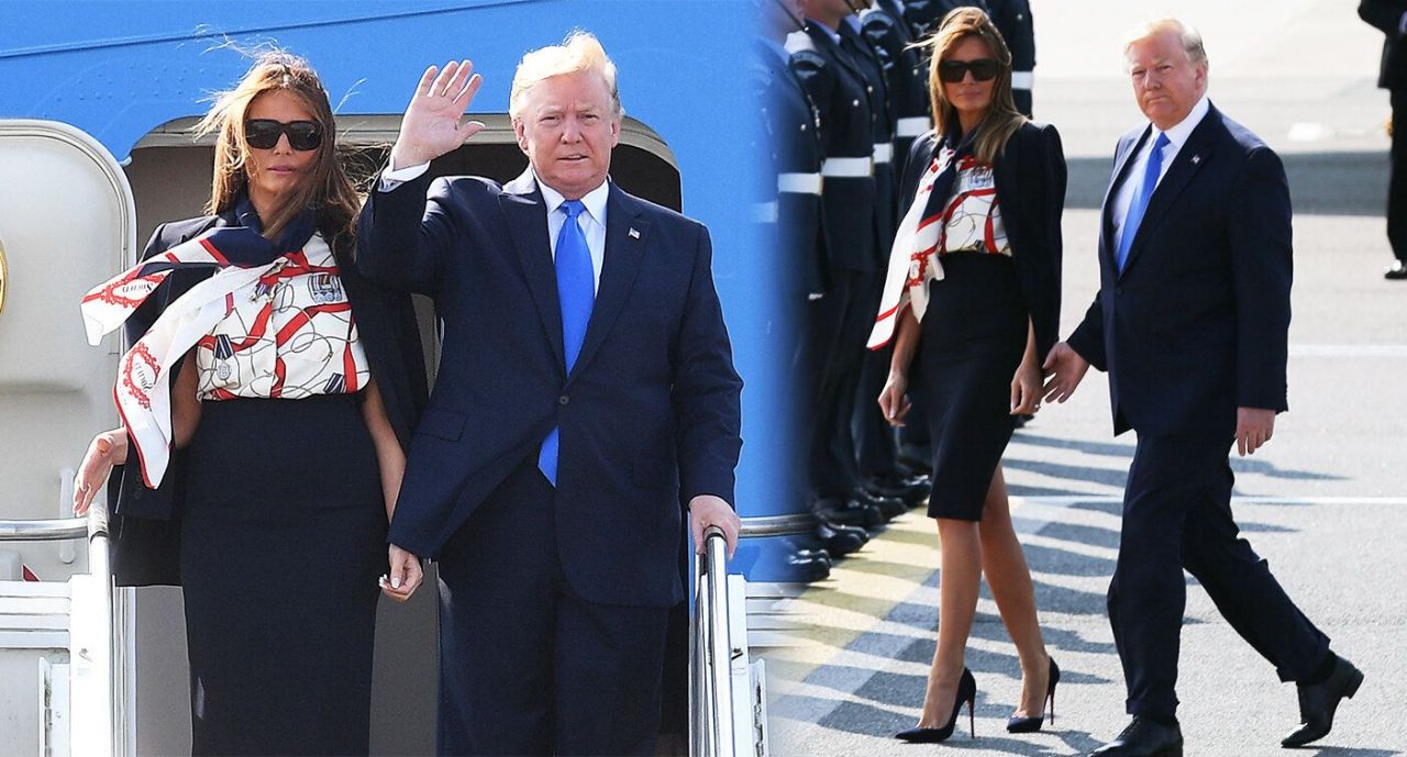 The first lady paired the [Burberry] blouse with a navy Michael Kors skirt suit. As Kors is an American designer, the ensemble symbolizes the two countries. The medals on the top are also the FLOTUS’s nod to the upcoming anniversary of D-Day. Later this week, the President will travel to Portsmouth to mark 75 years since the D-Day landings.