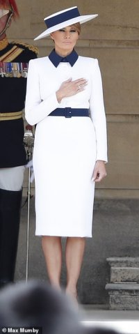 But instead of having fun with this fact, the supposed fashionistas in the press have mostly indulged their snotty, catty, petty, envious, Trump-deranged negativity towards Melania. A good example is the recent flap over her Burberry-scarfed blouse and the suit that went with it that she wore on her arrival in Britain: She looks like a flight attendant! they carp.