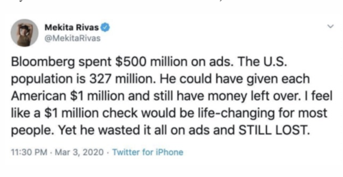 Mekita [Rivas], a writer at Glamour and The Washington Post, posted that Michael Bloomberg could have used the $500 million he spent on ads on the American people. She said he could have given everyone $1 million and have money to spare.