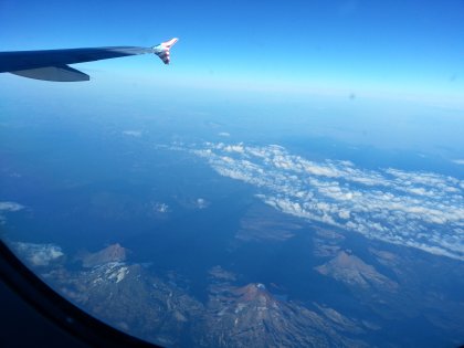 Yes, this photo was taken on a flight from southern CA to Seattle, and I have taken flight photos of all those volcanoes as well as Crater Lake. If the weather is at all clear, it is a phenomenal flight path. No sooner do you pass over one volcano than another looms up.