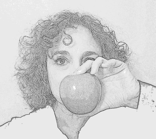The drawing shows her right eye more open, perhaps even almost naively accepting of what she sees; whereas in the official photo she is looking over the apple (as a shield) but also slightly squinting, suggesting skepticism and critical thinking, prior to acceptance. Maybe even a hint of cunning. And that is why we come here, to learn what she perceives.