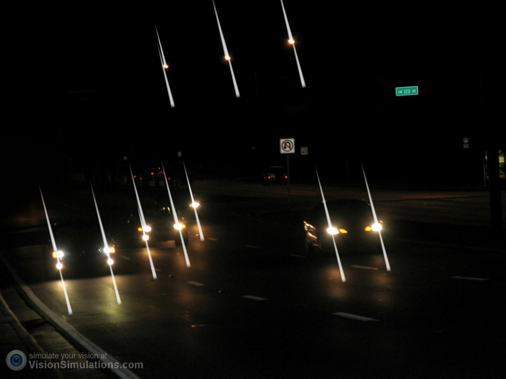 And the rays in this second picture are what I now see in my left eye around lights at night as a result of my surgery. They were not present before. I created this image at a site (see this; and by the way I had all the phenomena shown there except “trails”) that gives you tools to construct so-called “positive dysphotopsias” (see this article if you’re interested in learning more about the dysphotopsia phenomenon). This photo is very close to what I actually see around lights when I drive in the dark, combined with the rainbow halos. It’s still much better than my vision was at night before the surgery. The lights overwhelmed just about everything else back then, and of course the rest was blurry and lacked contrast. This is considerably easier to process out and focus on what I need to see instead: