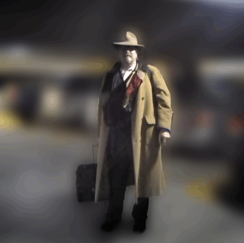 Tommy Jay, the effect you described is exactly what I was picturing. Keep a moderate amount of details/clarity of the background vehicles, but let the line of cars fade away at the ends, and crop so that fewer cars show in the line to the left of Gerard as we look at the photo. Keep that highlighted look, the drama of the light and shadow, on the central figure. But he’s also softly lit from above in a way that’s spiritual.